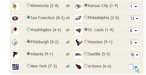 confident about. Your score will be the total confidence points of the games you picked to win.